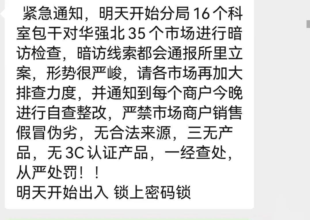 3月9日,代发客给记者发来一张“紧急通知”截图,称因3·15临近,市场监管部门将暗访检查,“大规模查货时市场会提前通知,我们凌晨两三点把商品全部搬走,50块一个的大纸箱,可以装好多箱。”