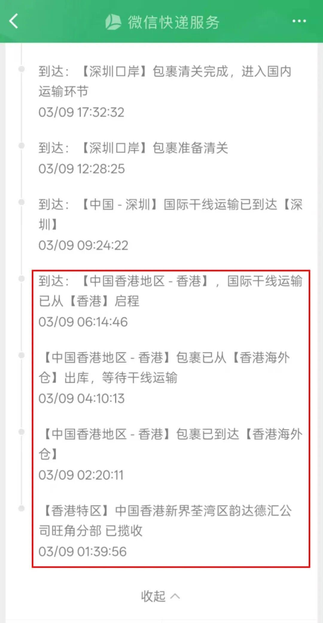整个过程中,记者未以个人身份信息实名下单,也未提供个人手机号码,而物流信息显示包裹由“香港新界荃湾区韵达德汇公司旺角分部”揽收,在深圳口岸清关。