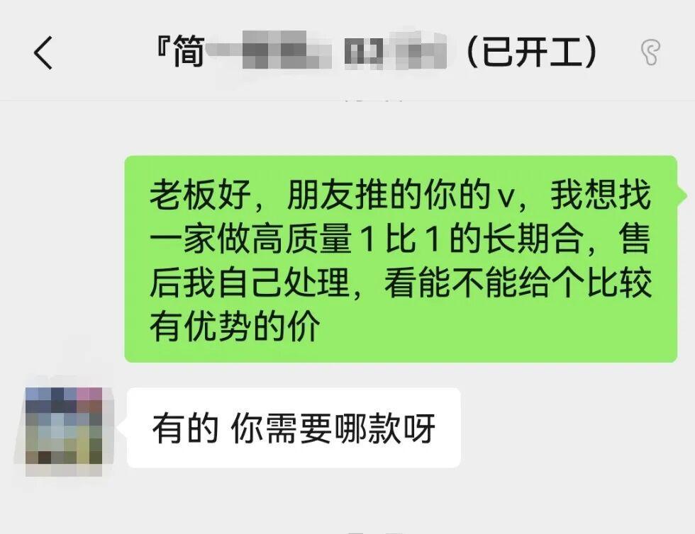 为进一步了解情况,记者从多途径添加数家商铺客服微信,询问是否在售高质量“1比1”假货,华强北明通化妆品市场A区与B区各一家商铺回应“有”。